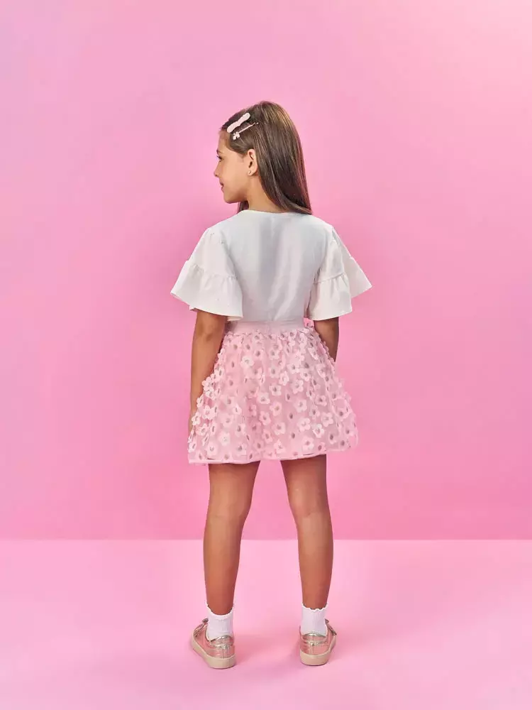 Conjunto infantil Cinti, blusa com pequeno bordado cinti, mangas bufante com babado e aplicações de strass. Saia de tule com aplicações de flores, elastico no cós, forro e short interno.